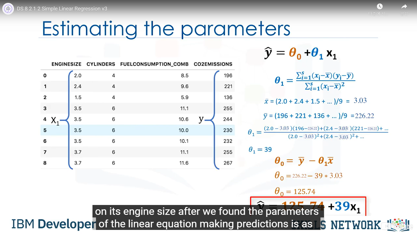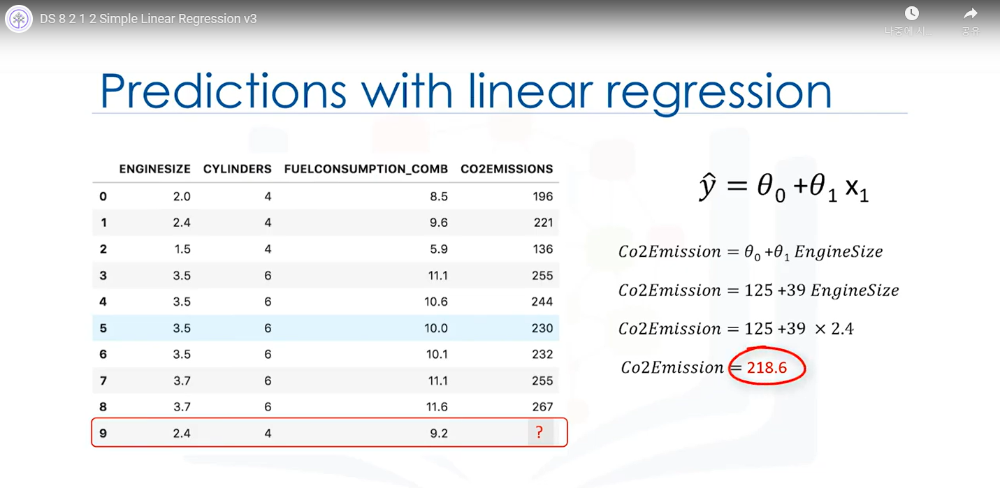 Co2Emission 구하는 과정: 먼저 쎄타0와 쎄타1의 값을 구한다. -> EngineSize 대입(x) -> Co2Emission(Yhat)출력